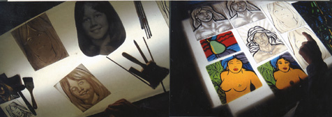 By the third day, we had several matte layers painted, edited and fired, eight of which are seen in the right-hand photo. It is amazing to see the "illusion" of three-dimensionality coming out of flat glass. But, with each layer of paint and the myriad tools and brushes and techniques we used, the depth of the images really increased dramatically. I think we actually worked for about 46 hours in four days, either painting or firing, or both! And, each piece was done in different ways, with different colors being applied in different sequences. Usually Peter demonstrated, and I followed. Other times we work simultaneously on our respective pieces, on our respective light tables. I had to remember to keep taking notes and grabbing the camera, as we conversed through dust masks and glasses, over brushes and psintings. I found my way back to my hotel at night, exhausted and my head swimming with information.